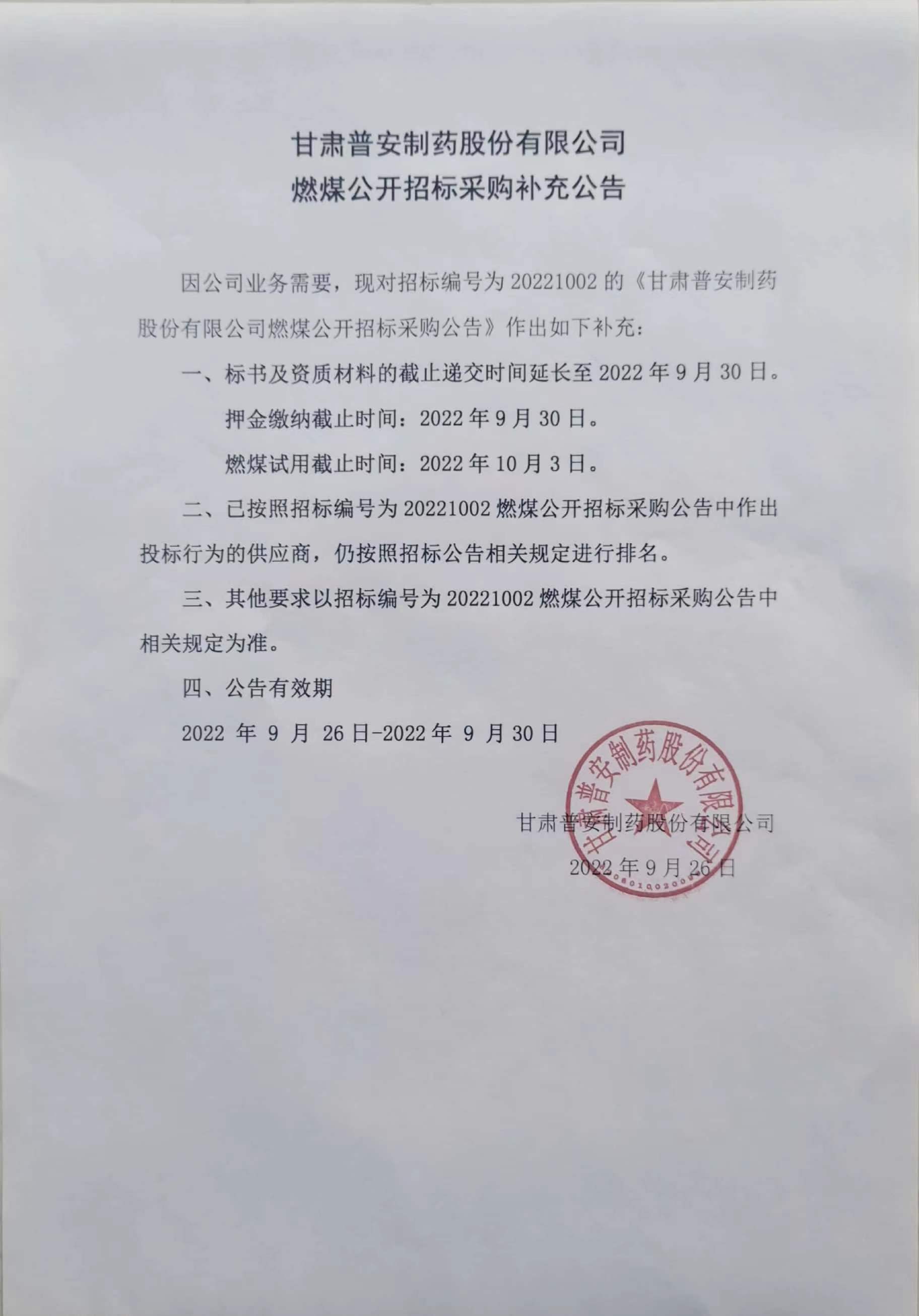 甘肅普安制藥股份有限公司燃煤公開招標(biāo)采購補充公告