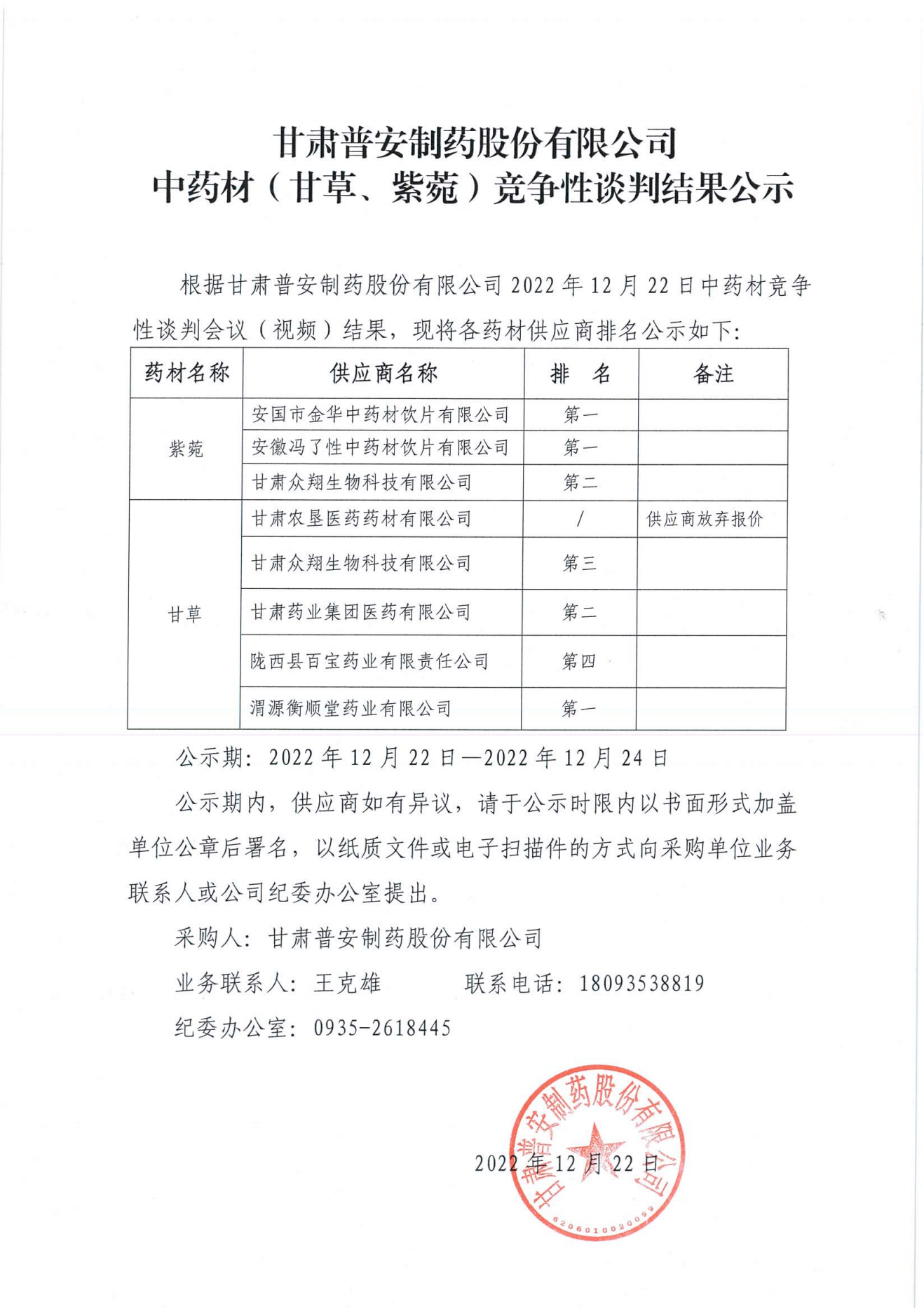 甘肅普安制藥股份有限公司 中藥材(甘草、紫菀)競爭性談判結果公示