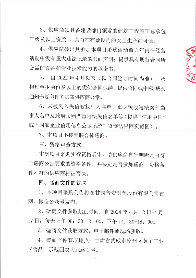 甘肅普安制藥股份有限公司2024年基礎設施改造項目-廠房維修工程競爭性磋商公告