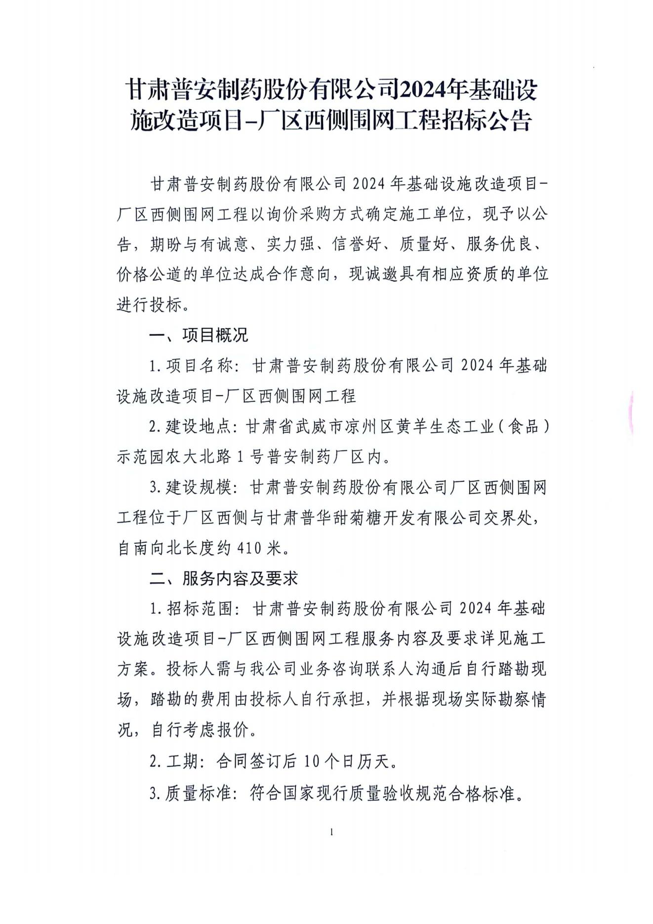 甘肅普安制藥股份有限公司2024年基礎設施改造項目-廠區西側圍網工程招標公告