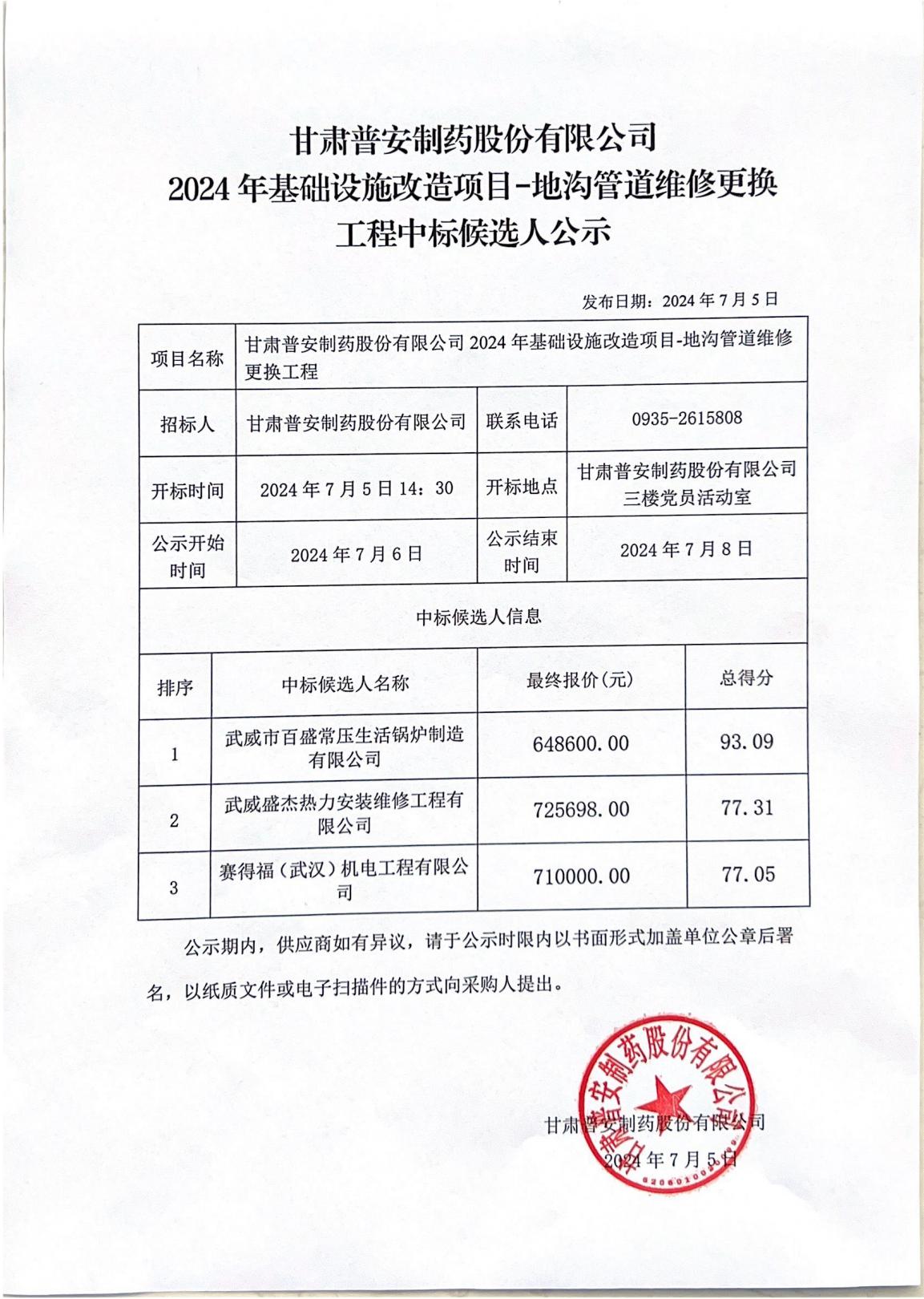 甘肅普安制藥股份有限公司2024年基礎(chǔ)設(shè)施改造項(xiàng)目-地溝管道維修更換工程中標(biāo)候選人公示