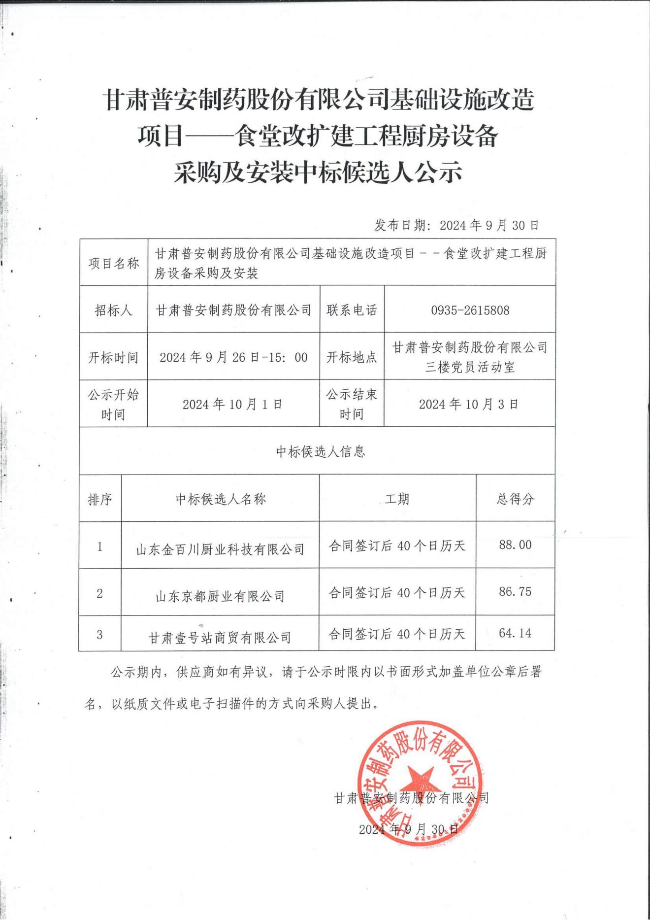 甘肅普安制藥股份有限公司基礎設施改造項目--食堂改擴建工程廚房設備采購及安裝中標候選人公示