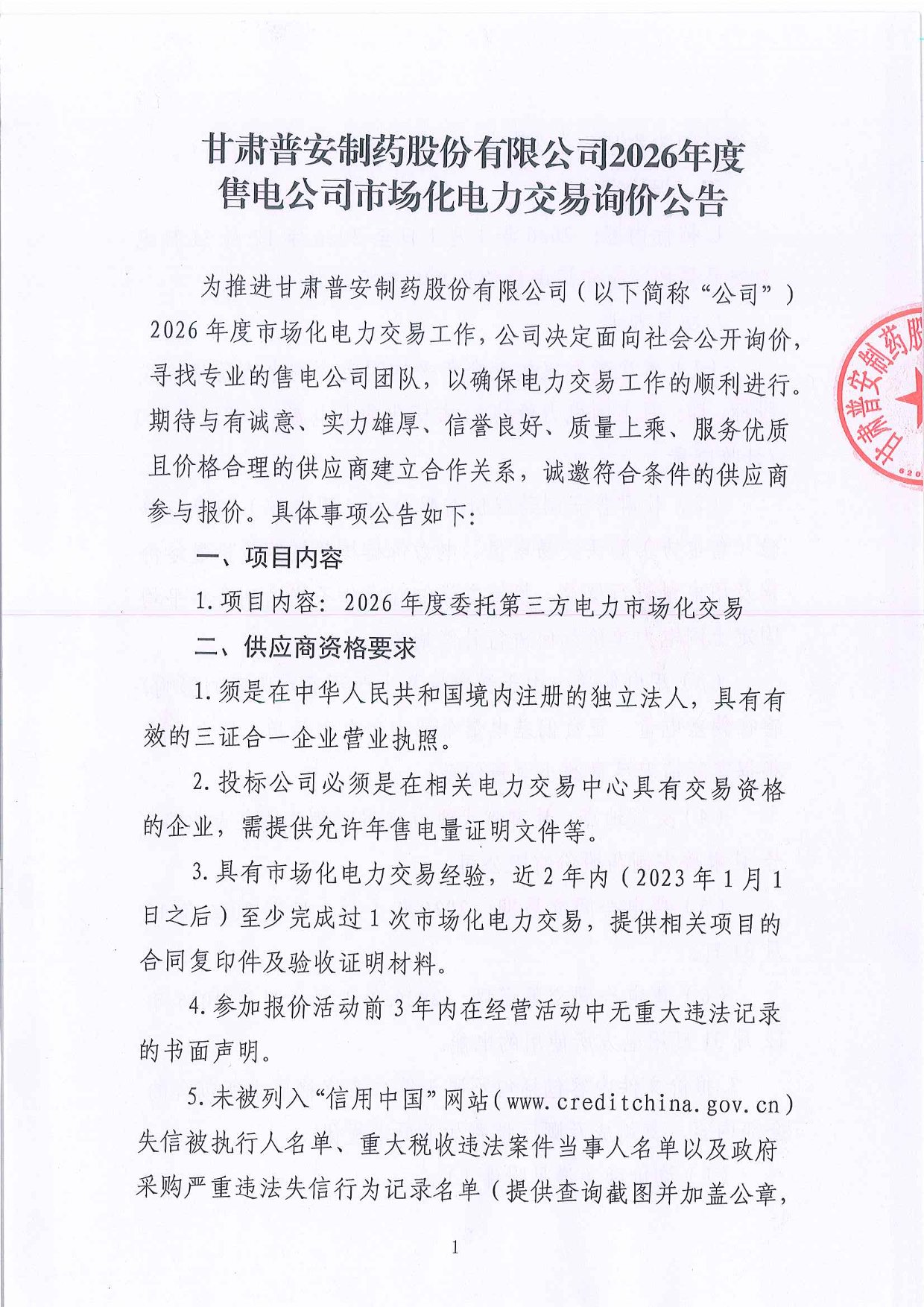 甘肅普安制藥股份有限公司2026年度售電公司市場化電力交易詢價公告