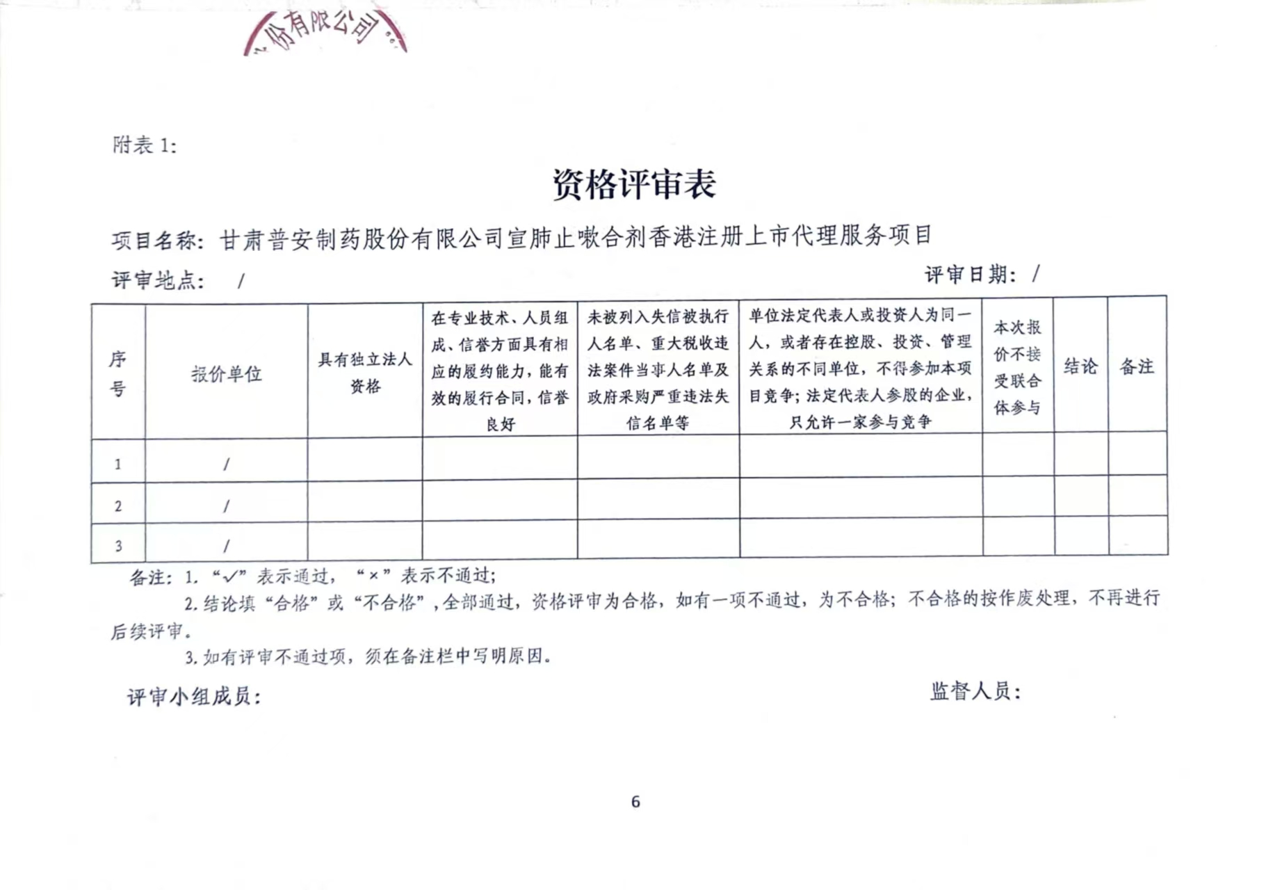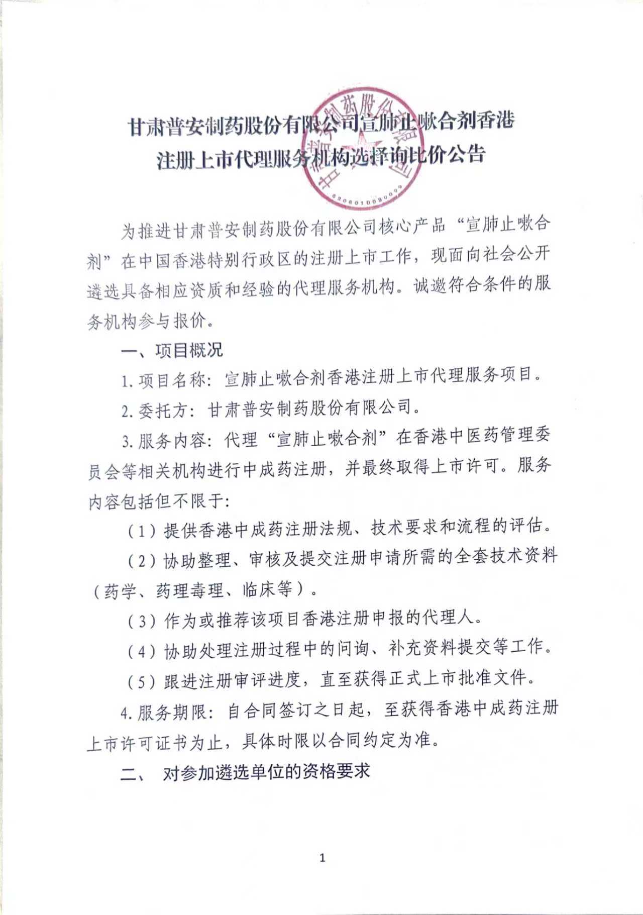 甘肅普安制藥股份有限公司宣肺止嗽合劑香港注冊上市代理服務機構選擇詢比價公告